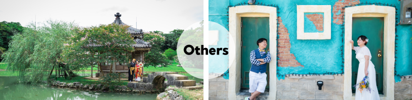 | A. 衣装のラインナップは、専用ページよりご覧いただけます。 ・ウエディングドレス:約30種類〜 ・メンズ衣装:約20種類〜 ・琉装:約10着〜 ・衣装小物:約30種類〜 ※衣装や小物は随時入荷・入れ替えを行っております。 |
