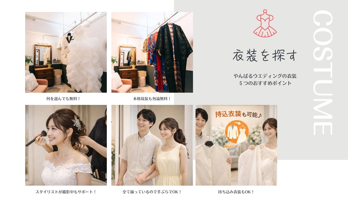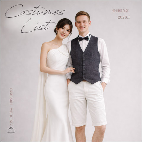 | Q.衣装は何種類ぐらいありますか? | A. 衣装一覧はこちらからご覧頂けます。 ウエディングドレス30種~ メンズ20種~ 琉装10着~ 衣装小物30種~随時入荷中です |