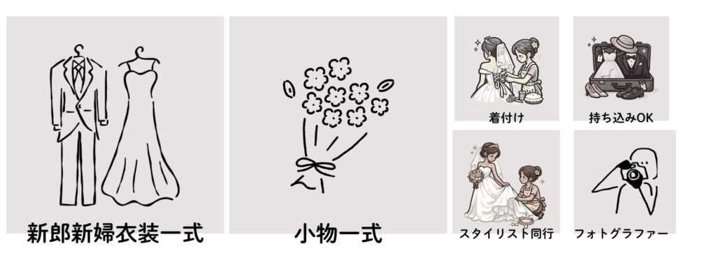 | Q.衣装や撮影小物の持ち込みは可能ですか? | A. 衣装のお持ち込みは無料です。お気にいりのドレスのお持ち込み大歓迎です。 思い出のお品やお好きなグッズもお持ち込み可能です。50カット以上のプランをお申込みくださいませ。 |