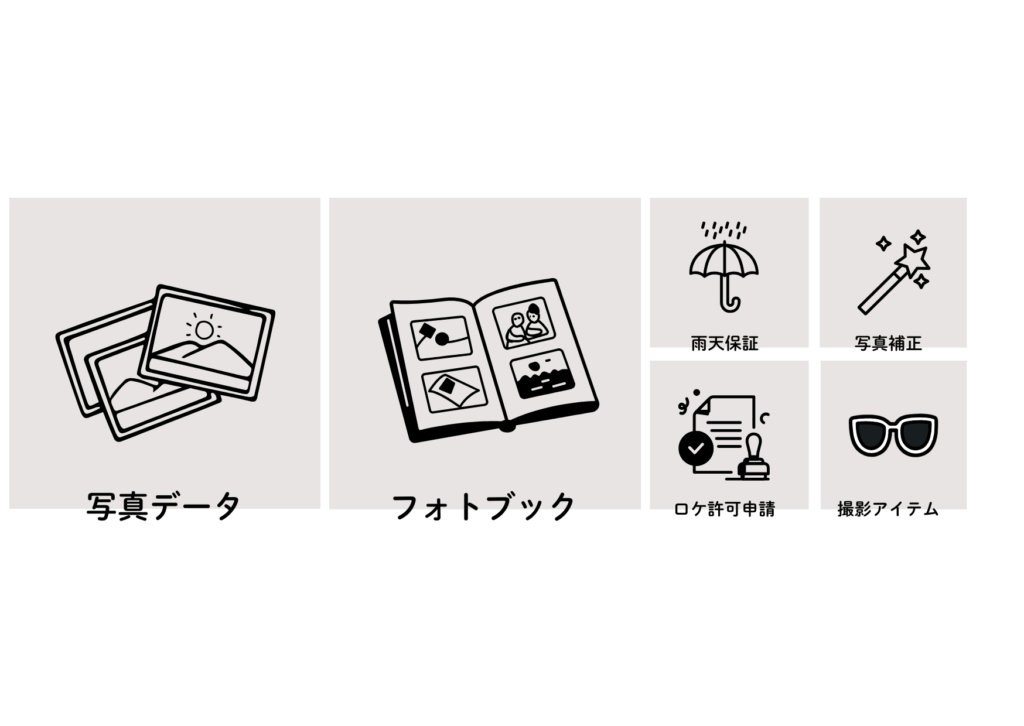 | Q.自分たちのカメラでも撮ってもらえますか? | A.50カット以上のプランをお申し込みのお客様に限り、お預かりしたスマホなどでの撮影は可能ですが、撮影の合間の簡単な撮影となります。50カット以下のプランや一眼レフやデジタル一眼などのご利用はご遠慮いただいております。 |