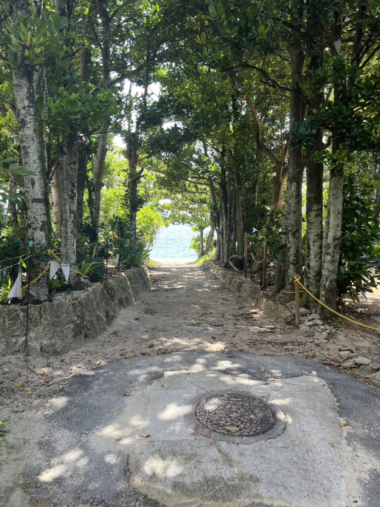 フクギのトンネルを抜けると、目の前の視界は一気に開け、エメラルドブルーの海が広がります。